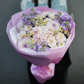 Букет "Сады Версаля" из маттиол, георгин, гортензии и кустовых хризантем