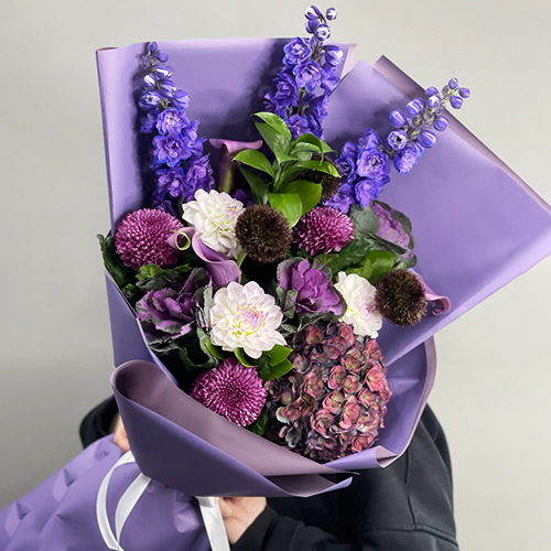 Букет "Лунное затмение" из Голландской гортензии, брассики, георгин, калл, дельфиниума, гербер Экзотик и хризантем Момоко