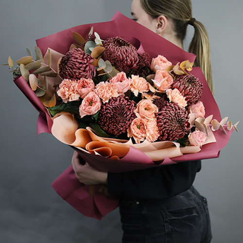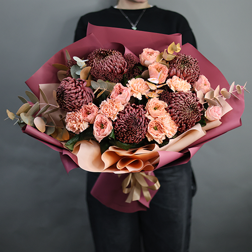 Букет "Осенний блюз" из хризантем Бигоуди, диантусов, скиммии и роз Риджентс парк