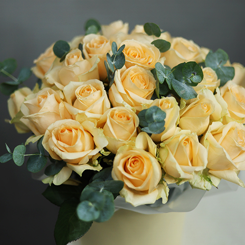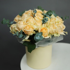 Композиция в шляпной коробке из 25 роз Аваланж и веточек эвкалипта